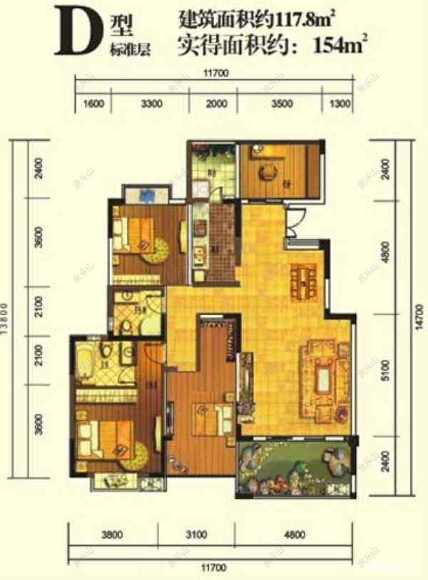 D户型为多层带电梯板式套三户型,建筑面积:约为117平米。
