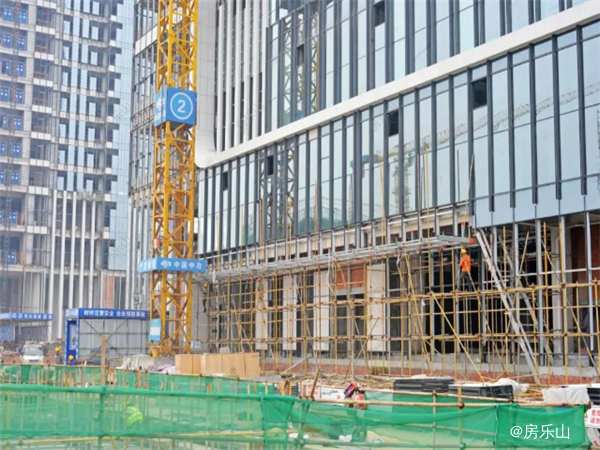 裙楼幕墙玻璃已安装完成,塔楼(5-18层)龙骨安装完成,玻璃安装完成25%;18-22层龙骨安装完成30%;楼顶造型钢结构施工完成70%。