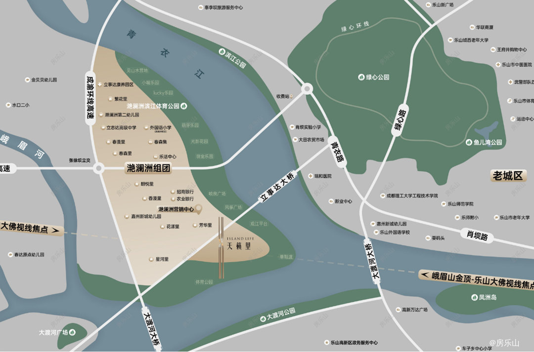 配套方面,教育资源涵盖乐山市肖坝实验学校、斑竹湾实验学校等公立院校,以及乐山外国语学校、立志达高级中学等私立院校,覆盖全龄段教育需求;商业配套则有新业中心,结合家门口的春森集、滨江商业,构建全业态生活体系,满足业主一站式生活需求。